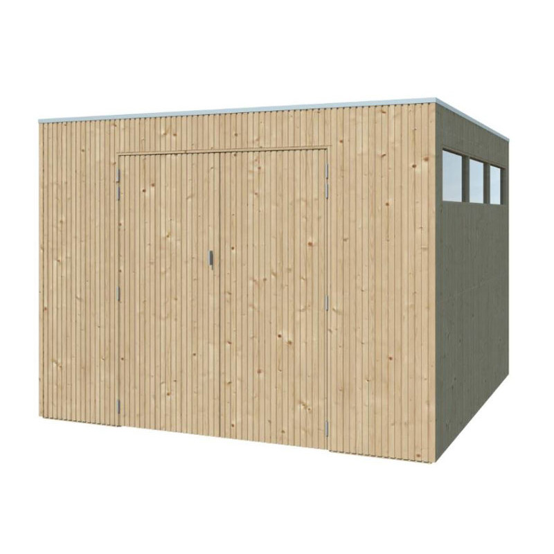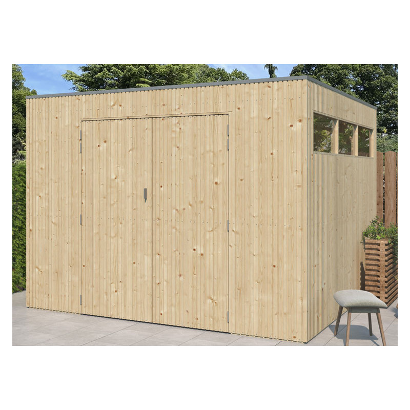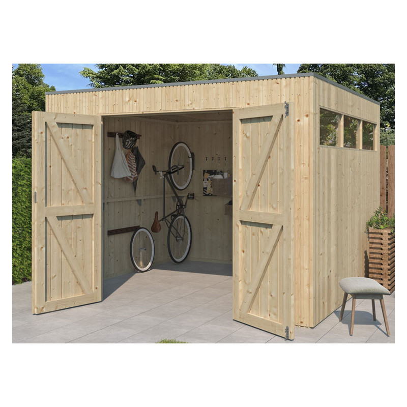 Son bardage vertical en bois massif lui confère un aspect naturel et chaleureux, parfaitement adapté à tous les styles d’extérieur. Pour un confort optimal, cet abri est doté de fenêtres sur la façade avant et sur une façade latérale, permettant un apport de lumière naturelle important tout au long de la journée.